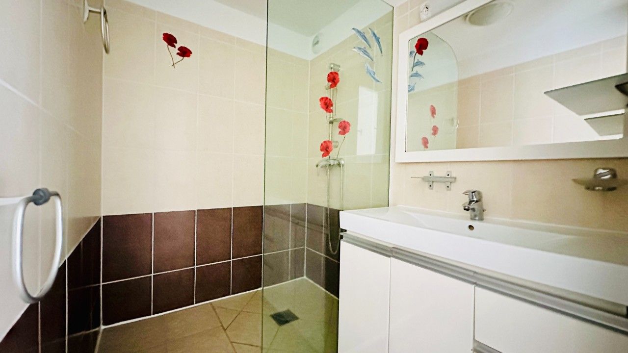 Le dégagement mène à une salle d’eau, des WC séparés, ainsi qu’à deux chambres climatisées avec placards, baies vitrées et volets roulants électriques.
