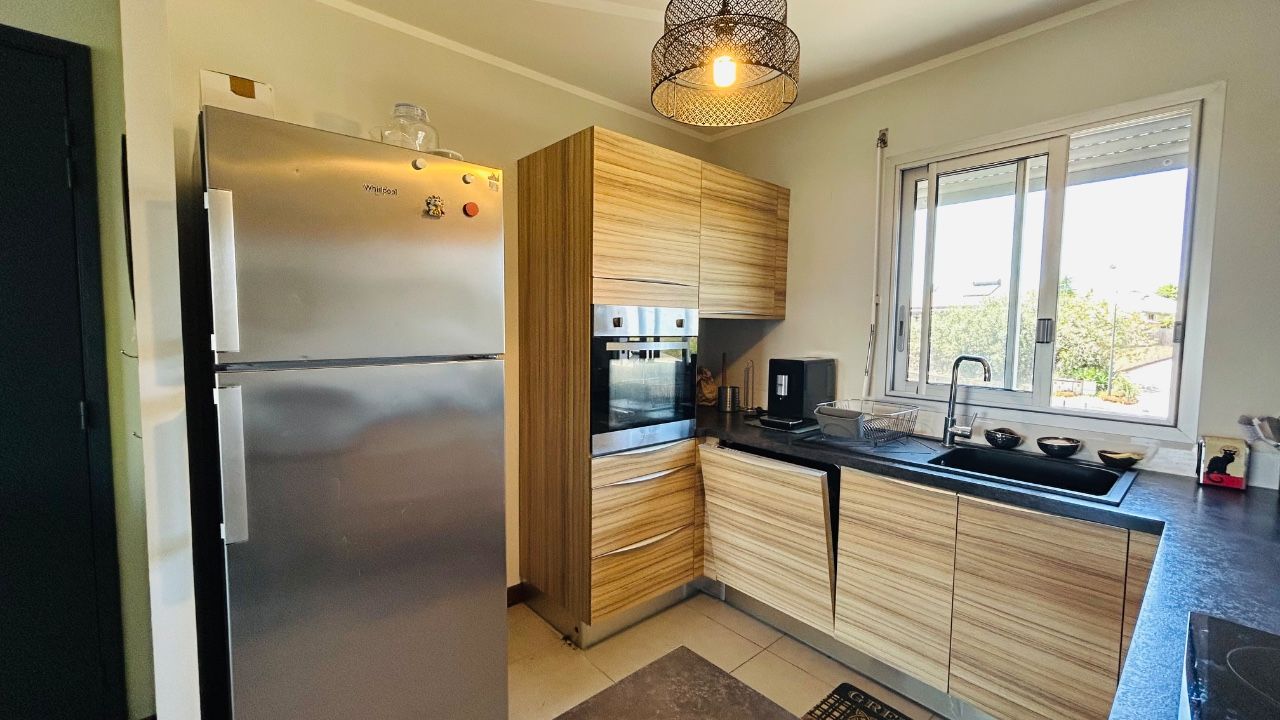 Une entrée sur un séjour lumineux avec brasseur d’air, volet roulant électrique, une cuisine ouverte aménagée et équipée (four, plaques, hotte et lave vaisselle), une chambre climatisée avec placard et volet roulant, une buanderie recevant la pompe à chaleur, une salle d’eau et un wc indépendant,