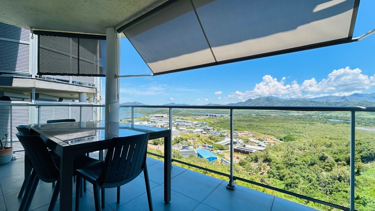 Une terrasse couverte de 15m2 avec stores bannes et bénéficiant d’une vue mer et montagne à 180°